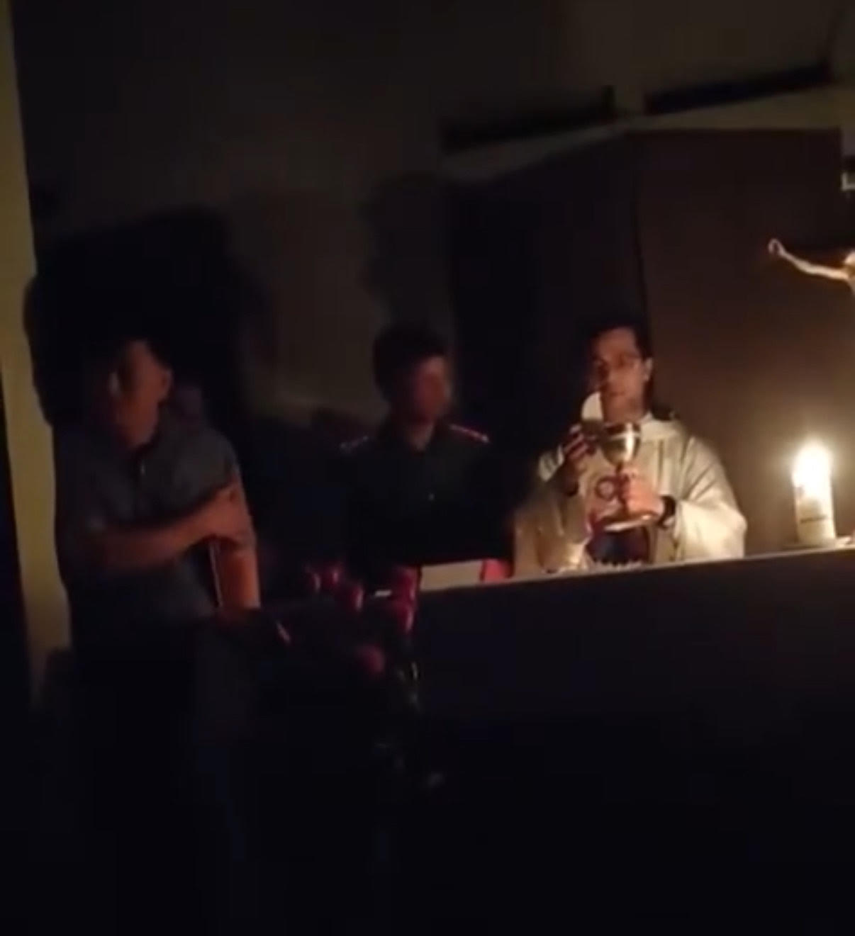 Hình ảnh từ hiện trường cho thấy nhà nguyện chìm trong bóng tối. Ca đoàn im lặng, nhiều giáo dân ngồi lặng lẽ, một số cụ già tiếp tục lần chuỗi Mân Côi dưới ánh sáng từ điện thoại di động.